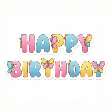 卡通手绘风格生日主题设计,白色纯色背景,上方悬挂彩色波浪形彩带和蓝色三角旗装饰,中央是立体效果的“HAPPY BIRTHDAY”字母,字母采用粉色、黄色、蓝色等明亮色彩填充,边缘有白色描边,下方散落彩色圆点、线条和闪电形状装饰元素,整体画面活泼欢快,色彩明快,充满童趣,图形元素排列错落有致,视觉层次清晰,符合生日庆祝的欢乐氛围。
