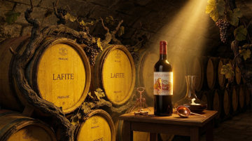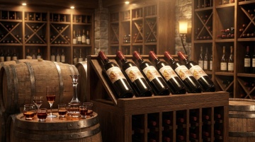 奢华酒店套房场景:红酒置于皮质床头柜,搭配水晶杯与香薰蜡烛,窗外夜景灯光虚化,营造私密尊享氛围