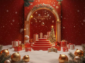 梦幻3D微缩圣诞场景,玻璃盒内鎏金礼盒与圣诞老人共庆佳节,雪夜烟花映衬温馨喜庆,重拟物与虚拟现实交融,尽显节日浪漫。