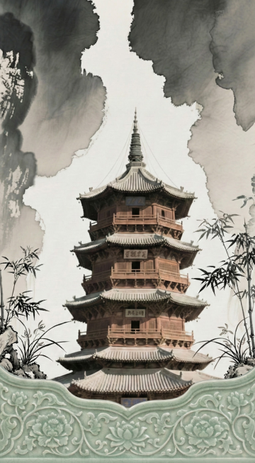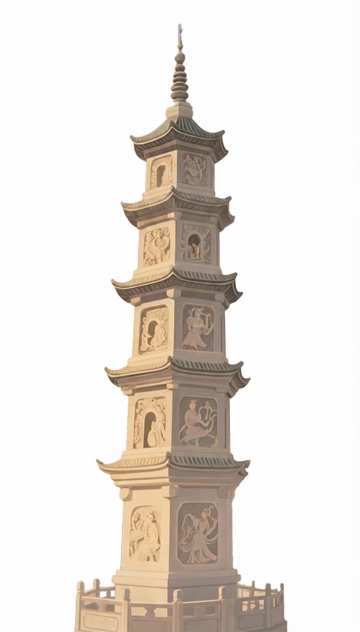3D重拟物风中式古塔,毛发生长质感覆盖建筑,融合古典神圣与质朴意象,呈现超现实东方美学。