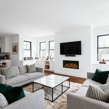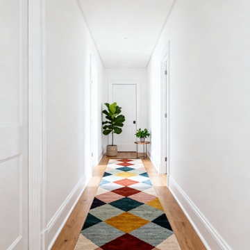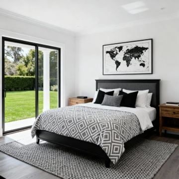 现代轻奢风格的家居过道空间,整体氛围明亮优雅,细节设计很有质感:露出白色平坦天花板, 空间设计:墙面是干净的白色,地面是浅木色地板,右侧是黑色谷仓门(带黑色金属轨道),左侧挂着带黑色色画框的装饰画,风格统一; 延伸感:过道尽头的门洞能看到其他空间的浅色软装(比如绿植),让狭长的过道显得更通透。