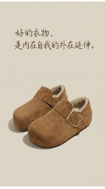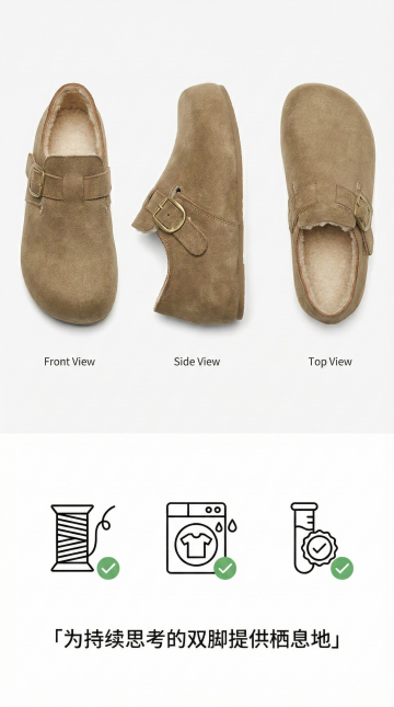 视觉:回归极简。产品正面、侧面、俯视三视图等距排列于纯白背景上。 底部文案: 「一双鞋, 为专注的日常, 提供不被干扰的舒适。 这就是它的全部主张。」