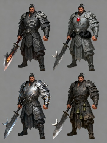 出三国的武将角色原画设计,灰色背景,造型类似参考图的武将的盔甲和色调,身材魁梧,手持大刀,站立姿势,出四个方案