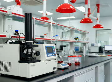 一个干净规整的现代化实验室场景,采用写实风格,以蓝白色调为主,光线明亮柔和,具有清晰的光影层次和细腻的质感表现。画面中可见身着白色防护服的研究人员在先进的白色和蓝色精密仪器设备旁工作,背景是带有规则几何图案的白色墙面。构图采用三分法,空间感强,整体氛围专业、严谨、科技感十足,适合作为背景使用。
