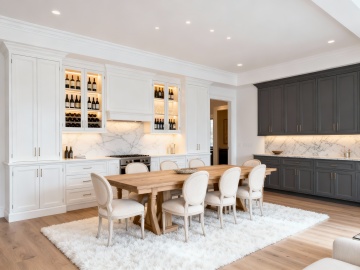 现代简约风格的开放式厨房 + 餐厅空间,整体设计清爽利落,配色以 “白 + 灰 + 深棕 / 黑” 为主,很有高级感~