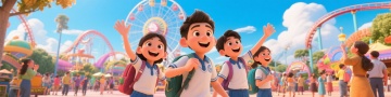 3D卡通风格,可爱的三花猫咪作为主角,在色彩鲜艳明亮的游乐场中,和一群不同颜色的猫咪们一起乘坐过山车,过山车轨道蜿蜒曲折,背景有旋转木马和摩天轮,猫咪们表情兴奋,画面充满欢乐氛围,高饱和度色彩,细节丰富,光线明亮