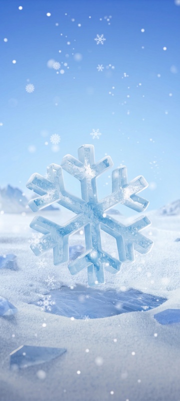 3D渲染风格的山水雪景海报,整体采用纯净的浅蓝色调,柔和的光线从上方照射,营造出宁静清冷的氛围。画面中,连绵起伏的山峦被设计成流畅的波浪形态,表面覆盖着半透明的冰层,冰层下可见细密的纹理,如同冰冻的湖面。山峰呈现出渐变的蓝白色,边缘有细腻的高光,增强了立体感和冰雪的质感。空中点缀着大小不一、形态各异的雪花,有的轻盈飘落,有的静静悬浮,雪花的棱角清晰可见,晶莹剔透。构图上,山峦从画面底部向上延伸,形成自然的视觉引导线,背景是渐变的浅蓝色天空,没有多余的元素干扰,整体简洁而富有设计感,突出了雪花与自然山水的融合,传达出纯净、静谧的冬日意境。