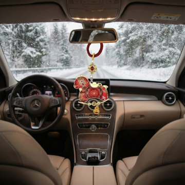 国潮风年货盛典海报,鎏金文字与祥云烟花点缀,重拟物香水瓶凸显金属质感,红金配色传递喜庆中式氛围,促销信息醒目,节日氛围浓厚。