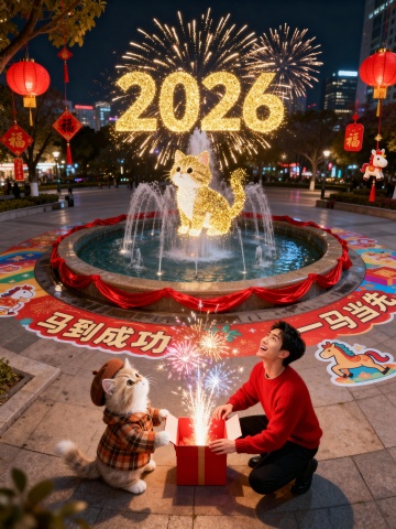 国潮风与超级符号风交融,鎏金粒子烟花绽放“2026”与猫形图案,实景夜景中融合喜庆红绸、电子屏与烟火礼盒,光影梦幻,中式年味跃然眼前。