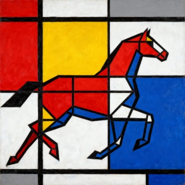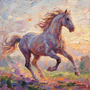 水彩风插画,朦胧梦幻的虚拟自然中,群马悠然游走,色彩交融,营造出静谧神秘的氛围。