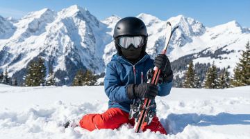 雪域实景中,3D风滑雪装备悬浮跃出收纳袋,重拟物设计融合现代科技感,蓝白配色彰显清爽时尚,虚拟现实般的动态构图尽显运动活力。