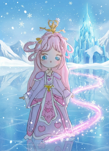 梦幻感十足的插画风雪国公主,融合可爱感与动漫风,软3D质感搭配水彩晕染,粒子光效点缀冰雪城堡背景,营造冬日童话氛围。