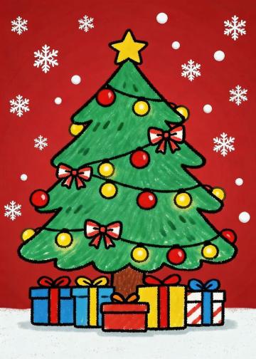 剪纸风与拼贴风结合的圣诞树,红绿金白层层叠叠,几何造型简约生动,金色星星点亮节日喜庆,温馨趣味跃然纸上。