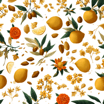 几何拼贴风格的夏日水果图案,以磨砂质感的象牙白为底色,网格状排列着几何化处理的柑橘切片:正圆形青柠切片(Pantone 362C)带有锯齿状白色描边,六边形柠檬切片(Pantone 102C)内部呈现放射状渐变纹理,不规则多边形莱姆切片(Pantone 382C)点缀着细小的白色圆点。每3个水果切片组成一个等边三角形单元,其间交错分布着四叶草变体图案——3片为标准心形叶片(Pantone 375C),1片中心嵌有微型柠檬黄(Pantone 108C)爱心。整体构图遵循黄金螺旋排列,元素间距保持精确的8px网格系统,所有轮廓采用2px圆角处理,营造出既结构化又充满呼吸感的现代设计,色调明快且具有数学韵律感,适合作为高端饮品包装或夏季主题数字界面的背景元素。