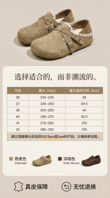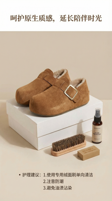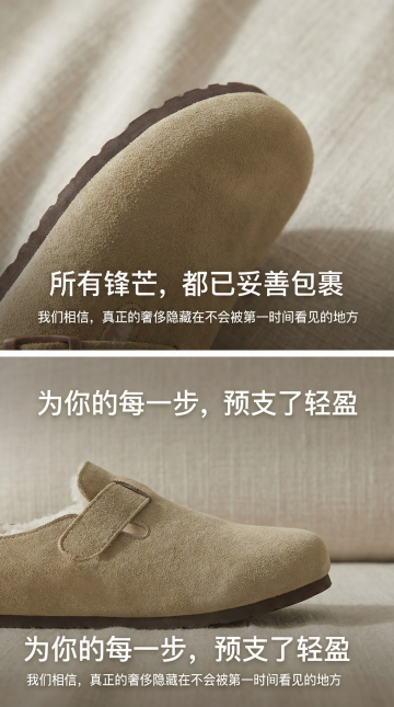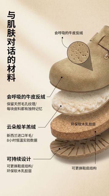 * 一张横向拼接的特写照片,从左至右依次为:牛反绒的微观绒面纹理、羊羔绒内里的蓬松截面、鞋底软木颗粒的细节。每个特写下方配一个极简的线条图标(如:透气图标、温度图标、支撑图标)。