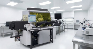 一个干净规整的现代化实验室场景,采用写实风格,以蓝白色调为主,光线明亮柔和,具有清晰的光影层次和细腻的质感表现。画面中可见身着白色防护服的研究人员在先进的白色和蓝色精密仪器设备旁工作,背景是带有规则几何图案的白色墙面。构图采用三分法,空间感强,整体氛围专业、严谨、科技感十足,适合作为背景使用。