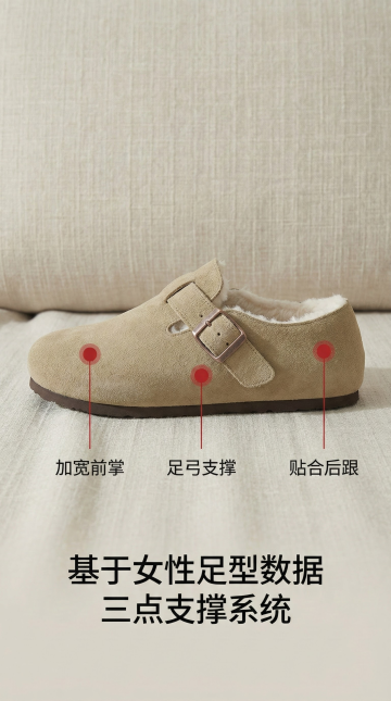 视觉:中心构图,背景为干净的浅灰色。 画面:一只鞋子以45度角悬浮(或置于透明亚克力架上),旁边以线条图或极简爆炸图的形式,解构其三大核心工艺点,并用细线连接至实物对应部位: 手工沿条缝制:图标(针线)。 可更换鞋底结构:图标(拼图)。 足弓承托设计:图标(曲线)。 文案(底部居中): 「显性的简朴,隐性的复杂