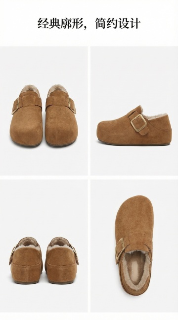构图: 女模特(只露出小腿以下部分,穿搭浅色棉袜或光脚)在室内木地板或浅色地毯上自然站立。鞋子占据视觉中心。 视觉焦点: 鞋子穿在脚上的松弛感与包裹感。羊羔绒内里与脚部的接触暗示舒适。 文案: 在画面空白处添加一行小字:“静奢,从步履间的舒适开始”。 氛围: 真实、舒适、居家。