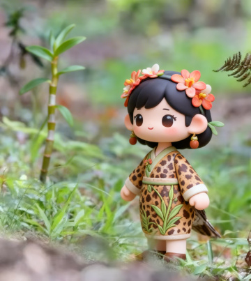 软3D风国潮娃娃,融合中式美学与梦幻色彩,樱花发饰点缀温柔面容,背景山水意境悠远,尽显可爱与唯美感。