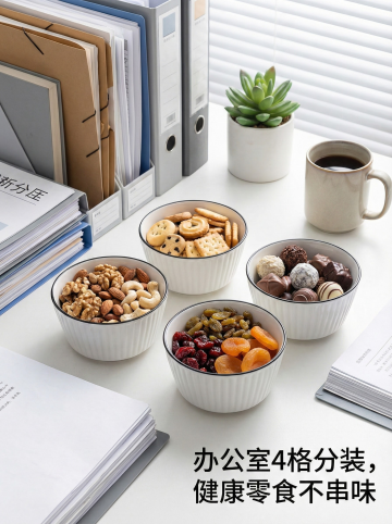 这是一只陶瓷碗,其名称为山田竖纹美式碗,碗口直径为4.5英寸。我给你提供了一张白底图,请根据我的白底图,帮我绘制6张不同角度的场景图。每张场景图比例为1:1,内容是将这只碗与不同的日常生活场景结合,并配上简要的卖点介绍。特别注意生成的场景图中,必须包括4个这样的碗,每个碗的造型、颜色或者样式都不能改变,必须和我提供的图片中的碗一样。碗的大小、摆放角度、位置可以根据场景的不同进行调整。
