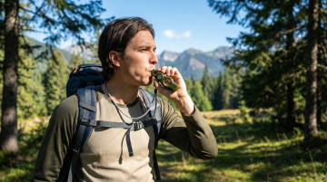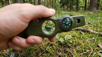 背景是夜晚森林中的地上,一支黑色战术手电筒的特写,一半的体积被雨水浸泡在水中(从地面泼溅而起,激起水花,水花晶莹剔透,折射着光线),背景是森林。