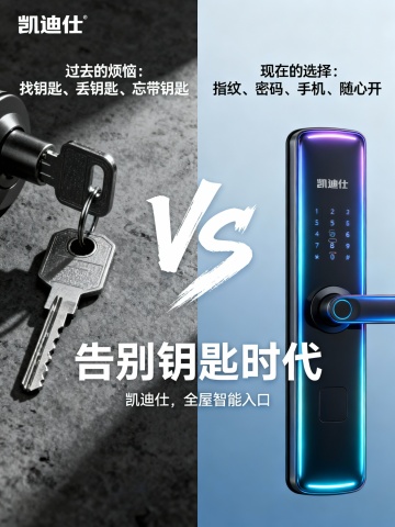现代简约科技感海报,主角是凯迪仕指纹锁特写,锁体高级有质感,正在发出蓝色光芒。背景是一扇微微打开的入户门,门外是温暖的家的光线。一个老人轻松一按,指纹识别成功,脸上露出微笑。旁边散落着几把传统的金属钥匙,一把钥匙正在化为数字粒子消散。整体色调是深空灰搭配科技蓝,光线柔和有层次感。标语“告别钥匙时代”,字体大气现代。底部标注“凯迪仕智能锁,全屋智能第一步”。高质量,商业摄影风格,超清晰,细节丰富。