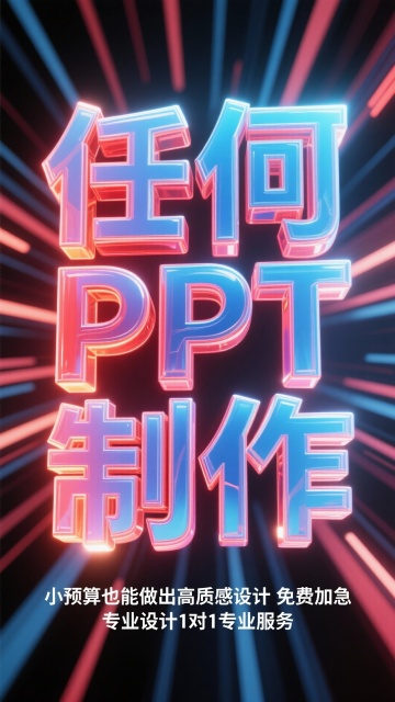 彩色偏红蓝色一点透明质感巨大立体字:任何PPT制作”,要突出 任何PPT制作 这几个字 这几个字还有发光的效果 背景放射线元素组成的场景 副标题是 小预算也能做出高质感设计 免费加急 专业设计1对1专业服务