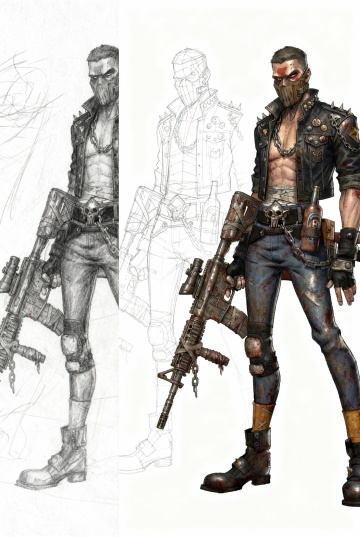 出三国的武将角色原画设计,灰色背景,造型类似参考图的武将的盔甲和色调,身材魁梧,手持大刀,站立姿势,出四个方案