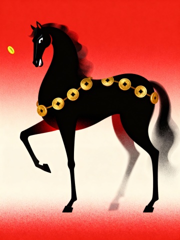 一张极具奢华感的新中式国潮插画,矢量艺术风格。画面背景是深邃、高饱和度的克莱因蓝,满铺着低调的、同色系的经典双宝相花海棠纹交织老花纹理,营造出奢侈品牌面料的质感。画面主体是一匹纯黑色的剪影骏马,呈现腾空奔跑的动态,线条流畅有力。马背上驮着一个圆润的黑色行囊包裹,包裹上饰有蓝色的祥云暗纹。马鞍垫设计精致木镶银錾花纹嵌松石珊瑚马鞍,底色为亮粉色,上面印有蓝色的五瓣梅花图案。马身周围漂浮环绕着一些扁平的亮粉色的中国古铜钱方孔圆钱和几枚粉色的金元宝图案,一串亮粉色珠串环绕在马边上,流苏飘逸。亮粉色的马笼头,