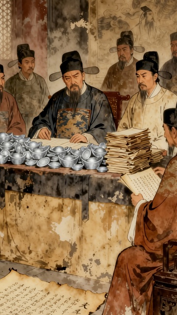 古典中式工笔风,水墨渲染山水背景,文人雅士静读古卷,意境深远。