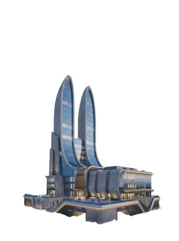 现代感与科技感交织的商务建筑,3D风实景渲染,玻璃与金属材质碰撞,光影流动,静谧夜空下星月辉映,简约主义设计尽显高端气质。