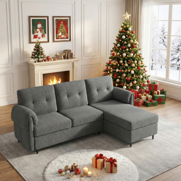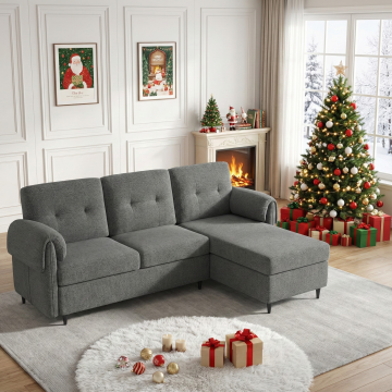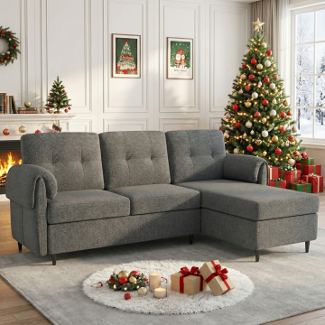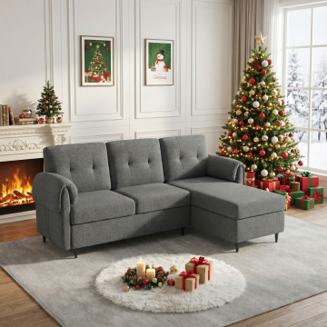 保持沙发角度不变,这是一个现代法式混搭风格的客厅场景,主体是一个灰色的沙发。白色的法式背景墙面上挂着两个绿色的花环,一个现代风格的收纳矮长柜子靠墙摆放,柜子上摆放了书籍,小圣诞树和摆件。柜子右边靠墙角的位置摆放了一个大圣诞树,树上挂着装饰球和米白色的丝带,顶部一个金色五角星,圣诞树下方堆放包装精美的圣诞礼盒,右侧是一个落地窗和薄纱白色窗帘,窗外能看见冬日风景。浅色的原木地板上铺设一大块浅色的纹理地毯。地毯上有一个白色的圆形毯子,上面放着圣诞礼盒和圣诞摆件“保持参考图中沙发的角度”