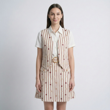 图中是一套发箍+领带+无镜片眼镜+发圈的四件套套装,请生成一张一个欧美白人年轻女性穿着学院服,戴着图中的发箍+领带+无镜片眼镜+发圈的四件套套装,白底图,实拍,全身图