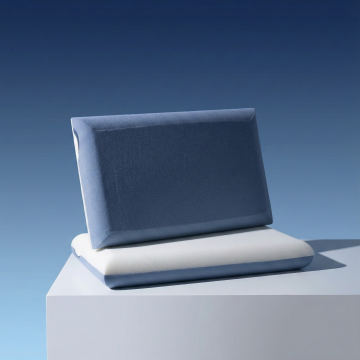 一位穿白色睡衣的女性,头部向右方向侧卧于参考图的枕上,不要改变参考图产品(呈现放松深睡姿态)。场景为深蓝夜空背景,点缀巨型朦胧满月,营造静谧氛围。构图以人物与枕具为视觉中心,满月作背景层次。色彩风格静谧高级,以白、深蓝为主,搭配满月的浅灰调,营造出太空深睡的氛围感。背景要素为深蓝夜空、巨型满月,无多余装饰,让记忆枕的舒适睡感与夜间深睡场景充分展现。比例3:4