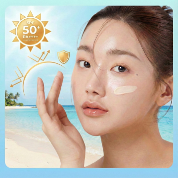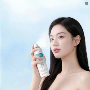 一张年轻女性手持护肤品、渐变紫色背景的美妆广告风格图片