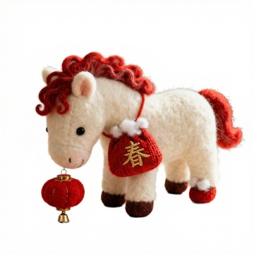 软3D毛绒马,国潮风设计,红白配色喜庆可爱,毛发生长质感细腻,手持灯笼,背挂“春”字福袋,萌趣迎新春。