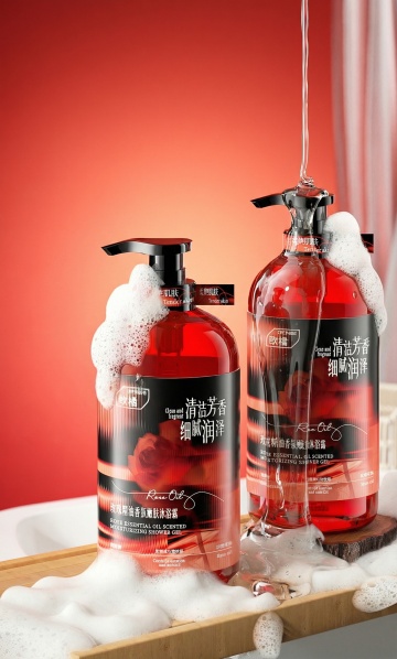 极简现代风洗发露,液态质感瓶身搭配柔和光影,清新绿植点缀浴室场景,传递清爽舒适与性冷淡美学。