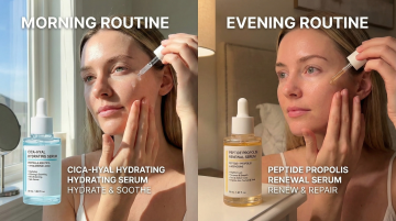 清新玻璃瓶置于虚拟自然水景中,花影轻舞,尽显清爽与清透感。