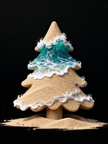 沙质圣诞树融合液态海浪,3D重拟物风呈现梦幻清爽的虚拟自然,清透波纹与体积感交织,演绎夏日节日奇景。