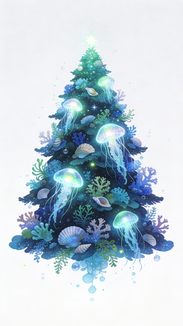 梦幻水彩风圣诞树,融合海洋元素与发光水母,营造清新唯美虚拟自然氛围,点缀珊瑚贝壳,粒子光效增添清透节日感。
