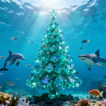 梦幻感与清透感交织的3D虚拟自然圣诞树,以液态玻璃风呈现,珊瑚鱼群环绕,星顶闪耀,节日氛围跃然于海底奇境。