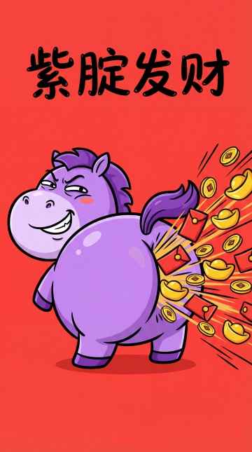 软3D风拟人小马手持红包,环绕金元宝与钞票,鎏金文字“发大财”点缀,喜庆卡通感十足,节日氛围浓厚。