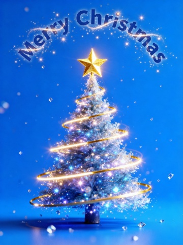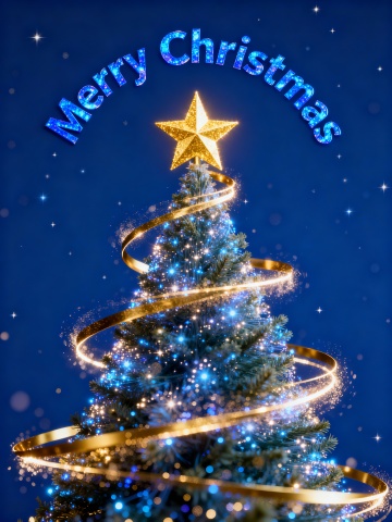 鎏金描边圣诞树,粒子光流交织,星辉闪烁,梦幻光影中尽显奢华喜庆,节日氛围浓郁。