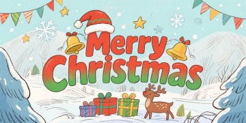 粉绒毛3D字体搭配雪景与糖果手杖,软萌卡通风营造喜庆甜蜜的圣诞氛围。