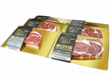 红金喜庆写实风,牛肉干包装袋与红绒展台、祥云金箔等新年元素结合,红火热烈,营造热闹喜庆的年货氛围。