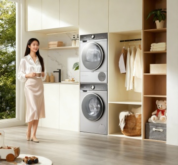 俯视角构图,极简未来主义风格的白色滚筒洗衣机悬浮于无限延伸的半透明亚克力平台中央,机身采用纳米级哑光白陶瓷材质,正面360度环绕式无边框全息观察窗正投射出流动的蓝色智能洗涤数据光效,窗沿镶嵌0.3mm超细钛合金边框形成精密的视觉分割。控制面板区域采用隐形触控技术,在通电状态下呈现冰蓝色LED虚拟按键阵列,中央旋钮带有钻石切割纹理并发出柔和的呼吸光。侧面的竖直线条采用激光雕刻的微米级凹槽,在45度侧光照射下形成精密的光影韵律。底部抽屉面板集成压力感应式开启装置,边缘倒角精确到0.5mm。环境采用4K超高清商业摄影标准布光,主光源来自左上方45度角的柔光箱,右侧配置补光灯消除阴影,背景为渐变的珍珠白到浅灰的渐变,底部铺设反光亚克力板形成微妙倒影,整体呈现出医疗级的洁净感与航天工程般的精密美学。