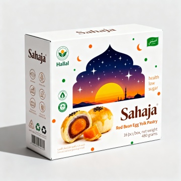 特写镜头,在一幅展开的古卷式背景上,精致的六角形红木礼盒静静置于青玉案几中央,盒面以螺钿工艺镶嵌出寒梅傲雪图,金线勾勒的"中秋月礼"四字印章庄重典雅。礼盒左侧斜倚着一柄象牙白瓷茶壶,壶嘴袅袅升起几缕金色茶雾,右侧铺展着三张酥皮月饼:一枚蟹壳黄的火腿五仁饼上撒着芝麻,一枚流心奶黄饼微微裂开露出琥珀色内馅,最前方的莲蓉双黄饼旁斜插着一支丹桂。背景是水墨渲染的远山与一轮朦胧圆月,案几边缘垂落着半透明的玉色流苏,空气中浮动着细小的桂花金粉。海报上方"月满人间·饼承心意"八个篆字采用烫金立体字,下方"苏式鲜肉 × 广式莲蓉 × 新式流心"的产品说明旁点缀着三枚迷你月饼剪影,整体色调以紫檀木色为底,搭配月白、蟹壳黄与桂花金,营造出雅致庄重的中秋礼赠氛围。