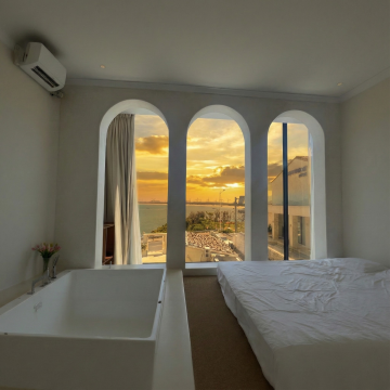 一座宏伟的现代风格酒店建筑,在黄昏时分的蓝色天空下,建筑顶部和底部有温暖的金黄色灯光勾勒轮廓,大量明亮的窗户透出内部光芒,前方有平静的水池,水面清晰倒映着建筑和灯光的美丽光影,周围有绿树和户外遮阳伞区域,整体呈现出高端、宁静且奢华的氛围,具有高度写实的摄影质感,光影细腻,色彩和谐。
