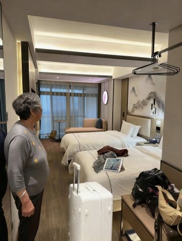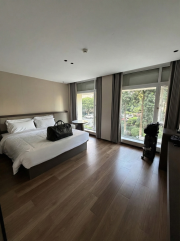 现代简约风格的高端酒店外观,黄昏时分,温暖的橙黄色灯光从建筑立面上的横向长窗和入口雨棚下的条形灯带透出,照亮米白色与浅棕色相间的石材幕墙和木质格栅,建筑呈对称结构,多层客房外带深色金属栏杆阳台,入口处有宽敞的门廊和几根方形立柱,门前停放着几辆轿车,周围有绿树环绕,天空呈现渐变的蓝紫色调,光影柔和,营造出宁静而奢华的氛围。