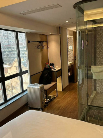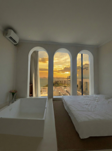 一座现代风格的高档酒店建筑,在黄昏时分的蓝色天空下,建筑顶部和底部有温暖的黄色灯光勾勒轮廓,酒店前方有一片平静的水面,清晰地倒映出建筑的灯光和轮廓,周围有绿树环绕,建筑底层有带遮阳伞的户外休息区,整体呈现出宁静、奢华、大气的氛围,建筑细节丰富,玻璃幕墙反射着天空的颜色,光影层次分明,画面构图平衡,具有强烈的视觉美感和高级感。